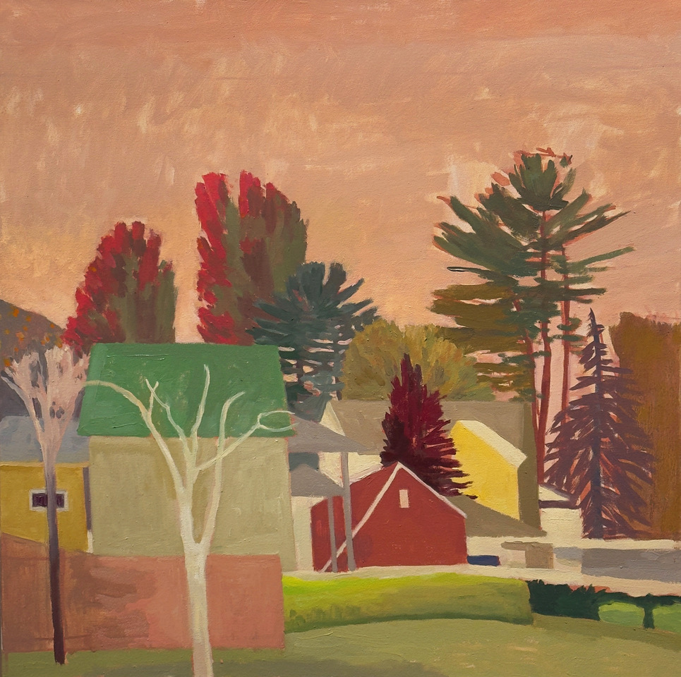 Known for her distinctive approach to color, form, and the familiar spaces of everyday life, Reisman transforms the ordinary into the extraordinary. What first appears as a faithful depiction of a suburban neighborhood or domestic interior unfolds, upon closer look, into an imaginative exploration of rhythm, geometry, and emotional resonance. Drawing from her surroundings, she juxtaposes architecture and nature to create compositions that feel both deeply personal and universally evocative.